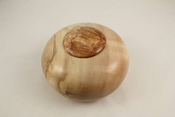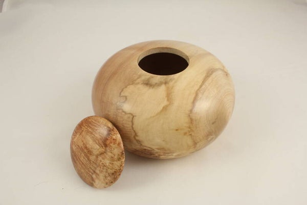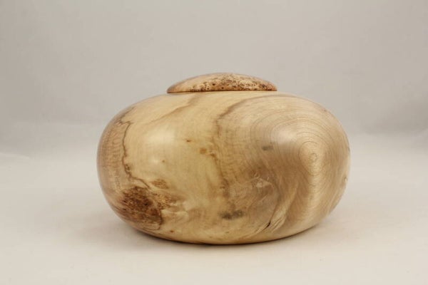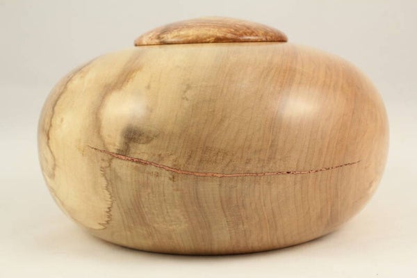 Deze urne is gemaakt uit zilveresdoorn met een accent van koper.