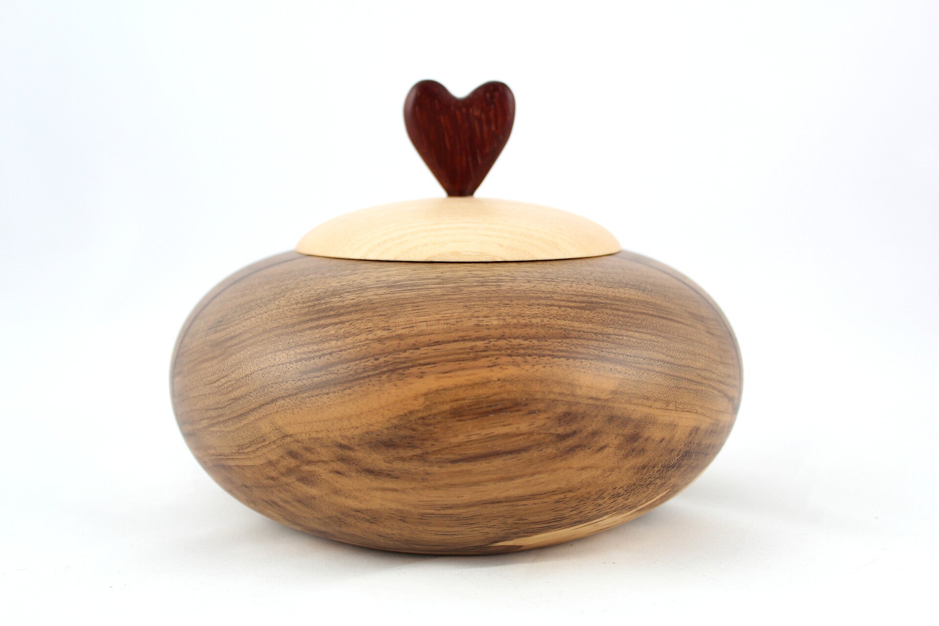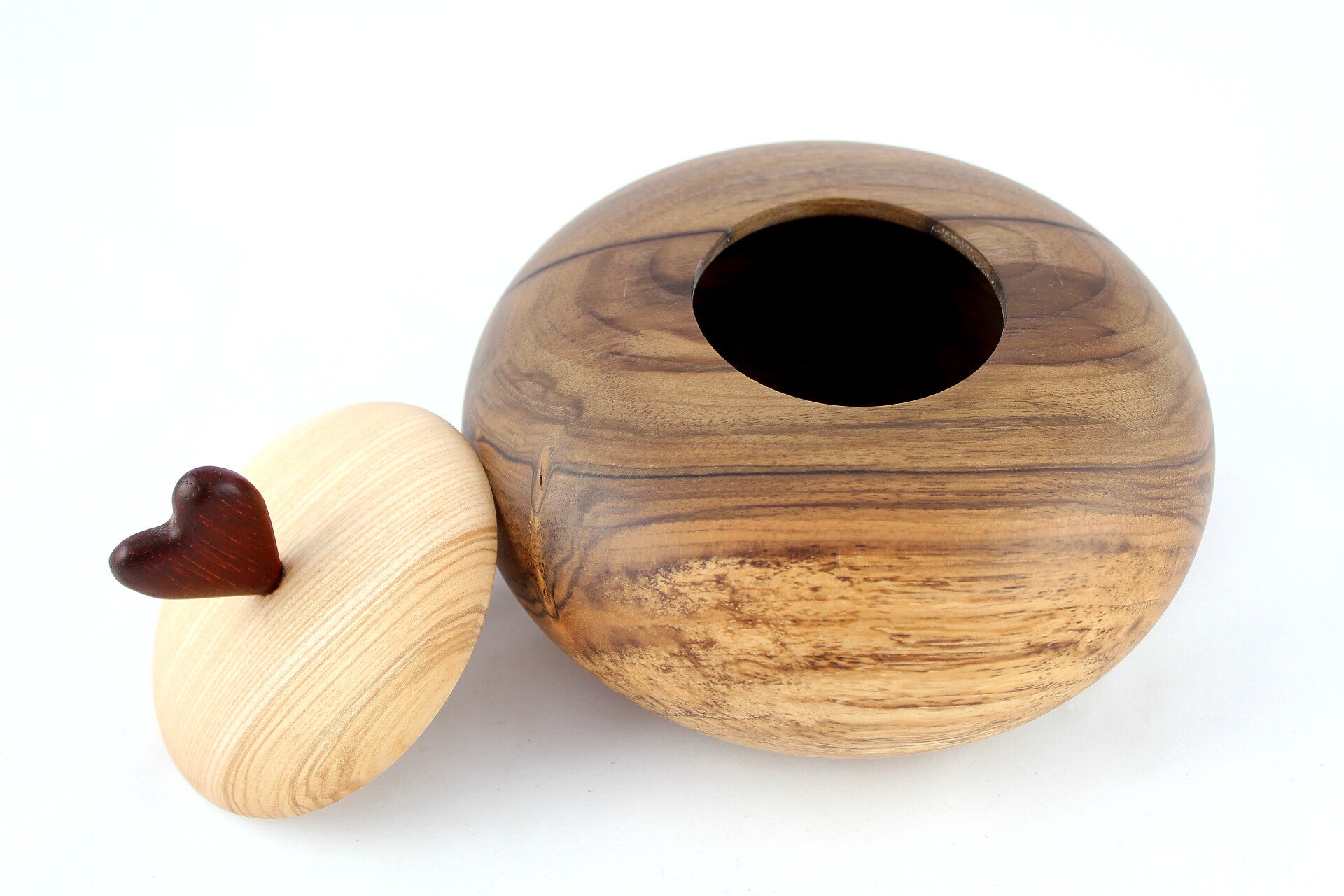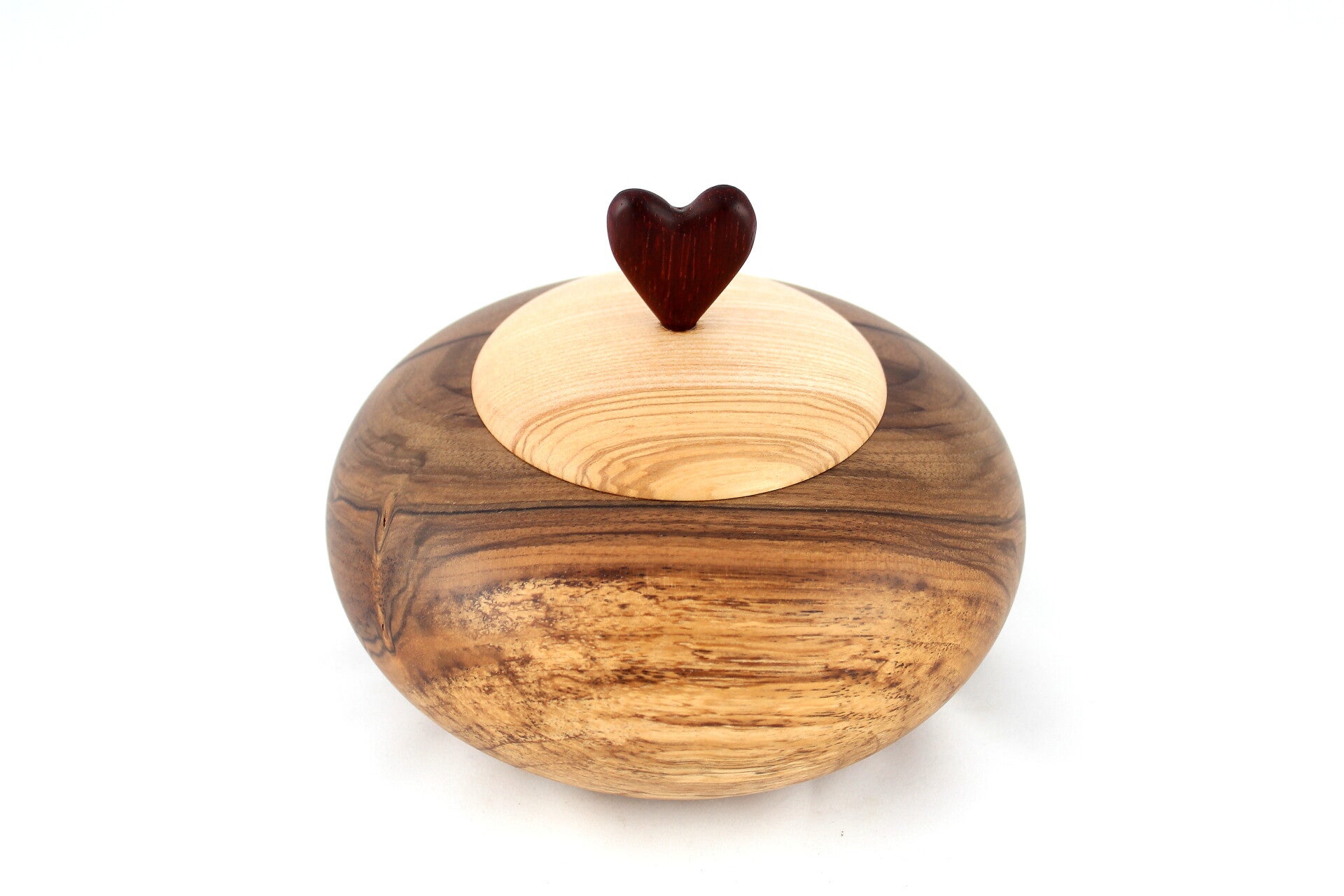 Deze holle vorm is gemaakt uit notelaar en het deksel uit olijfes en padoek