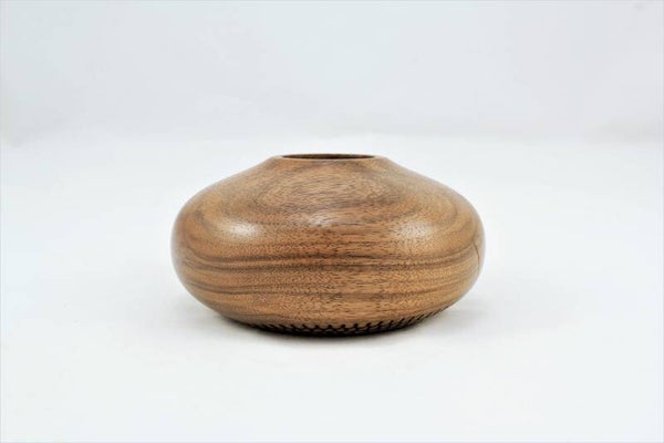 Deze holle vorm is gemaakt uit notelaar met een schubbenpatroon in gebrand.