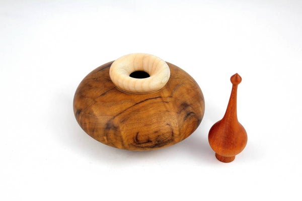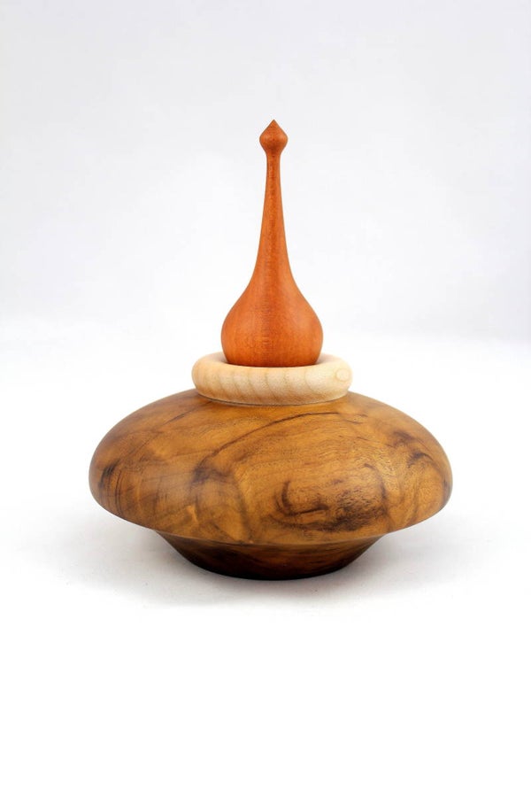Deze holle vorm is gemaakt uit imbula, de ring is esdoorn en de top is gemaakt uit een tropische houtsoort waarvan ik de naam niet weet.